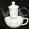 The glass teapot allows you to see the tea infuse which pours beautifully into your cut porcelain cup.