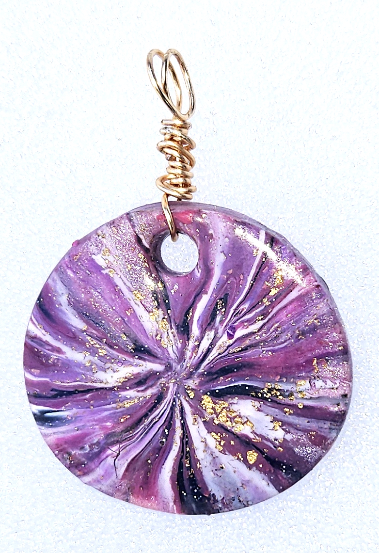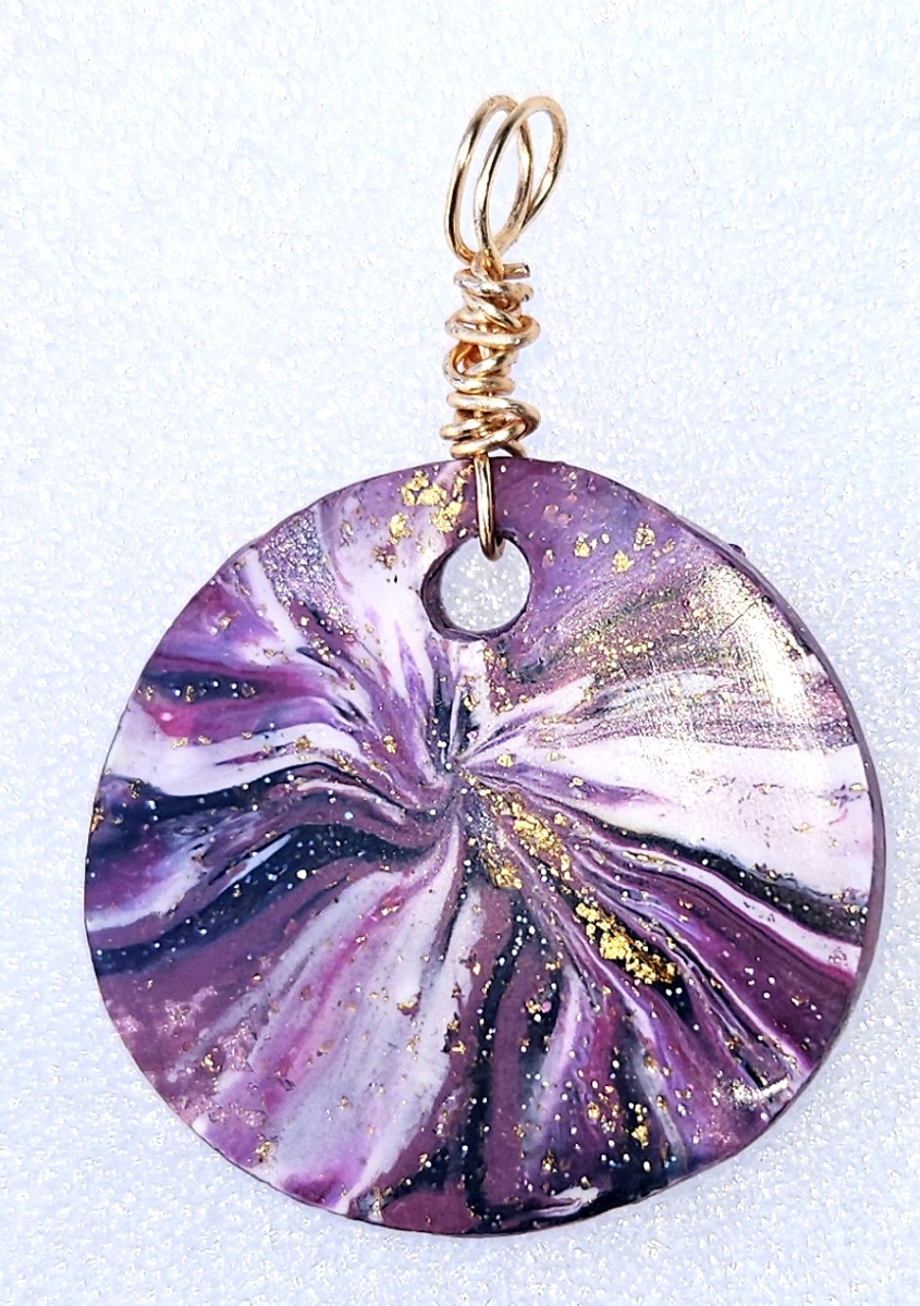 Polymer Clay Lentil Swirl Purple White Gold Pendant.