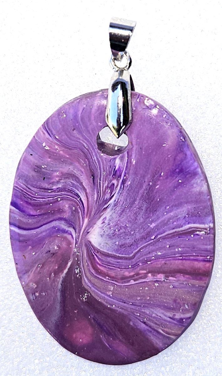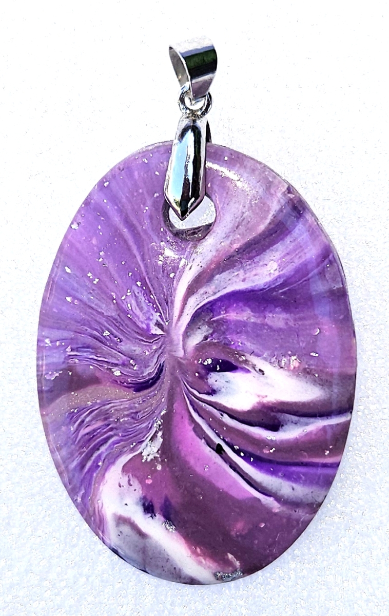Polymer Clay Lentil Swirl Purple White Pendant With Silver Flecks.