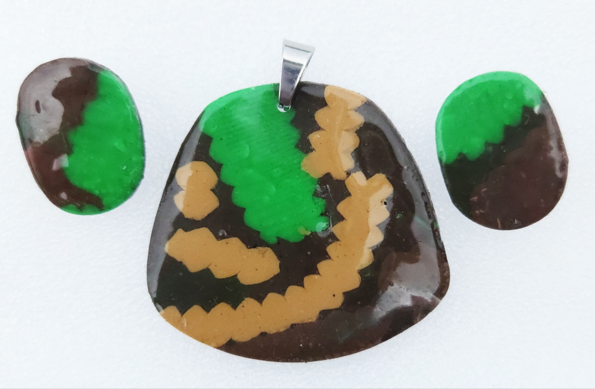 Polymer Clay Mokume Gane Green Brown Light Brown Pendant Earring Set