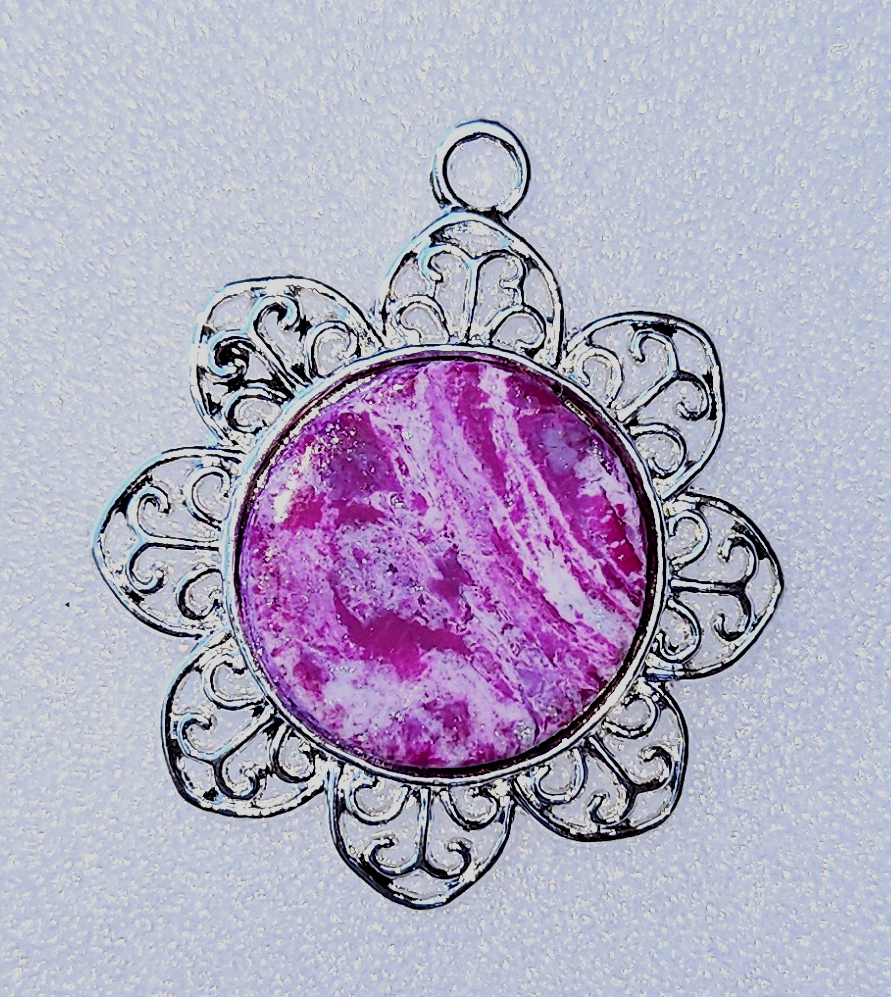 Polymer Clay Mokume Gane Pink, White On Silver Bezel Pendant.